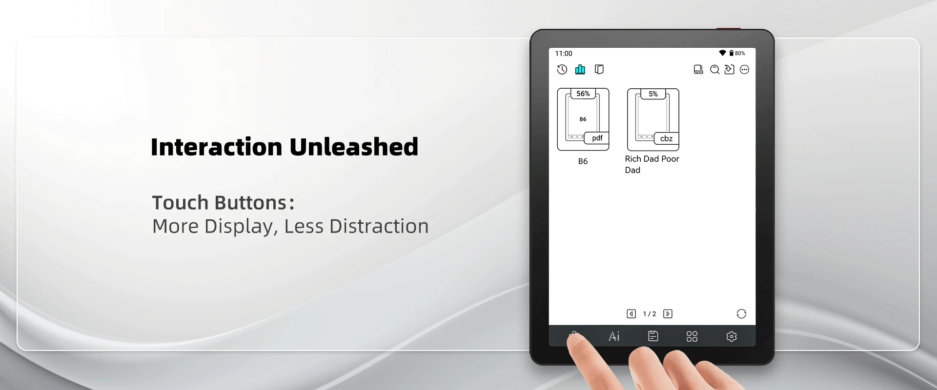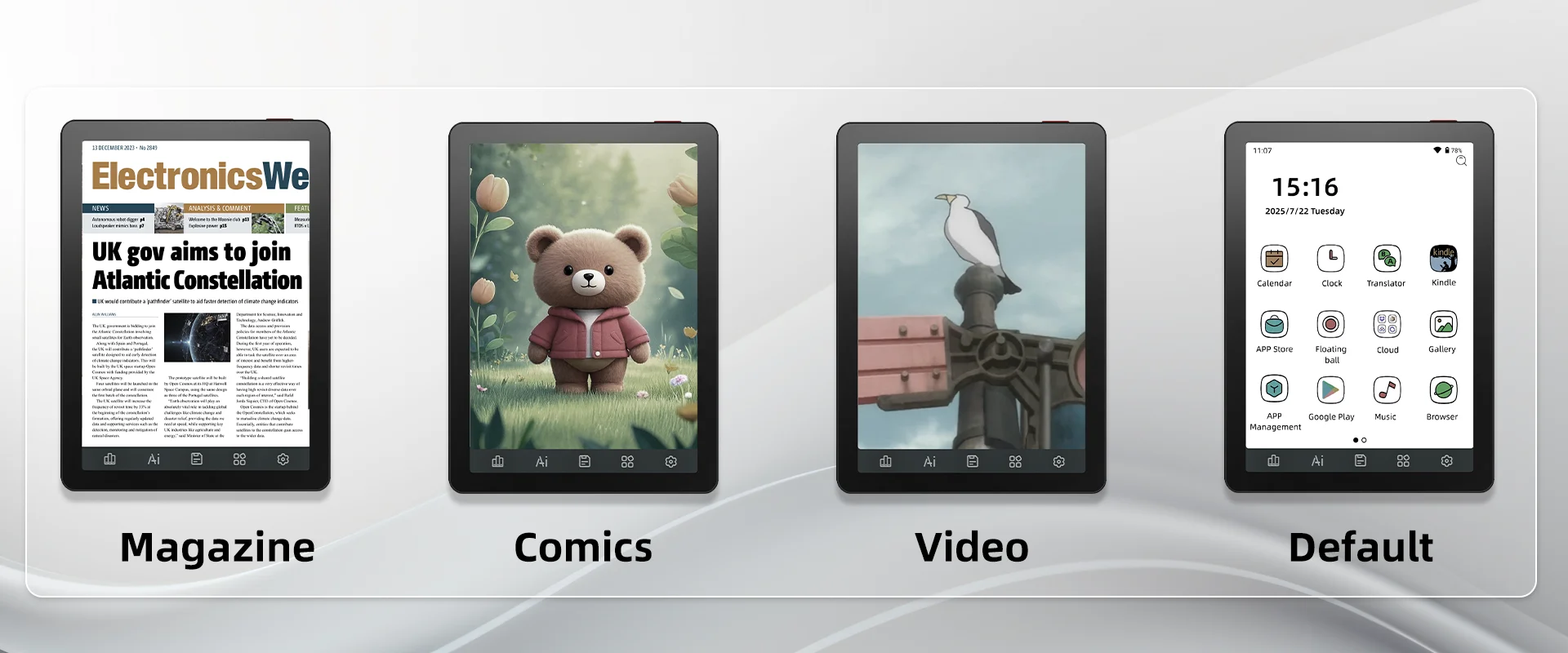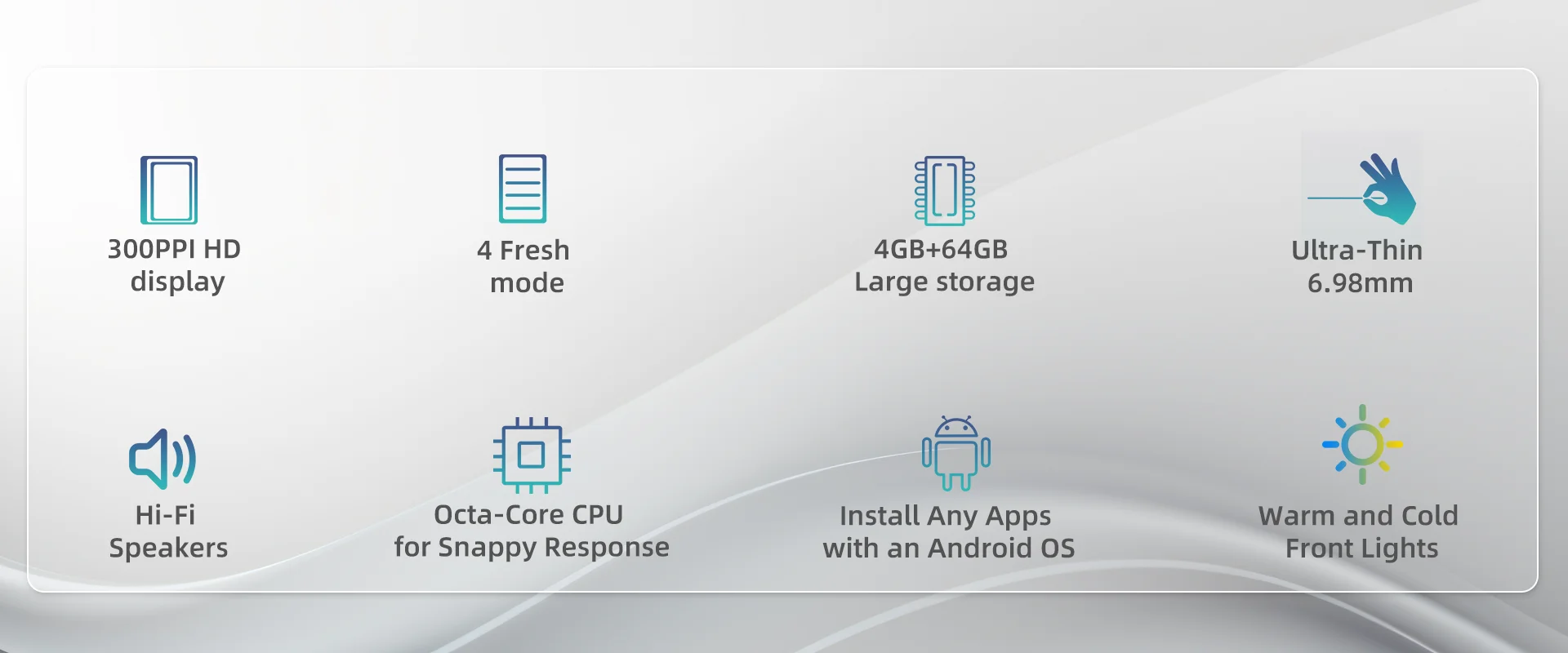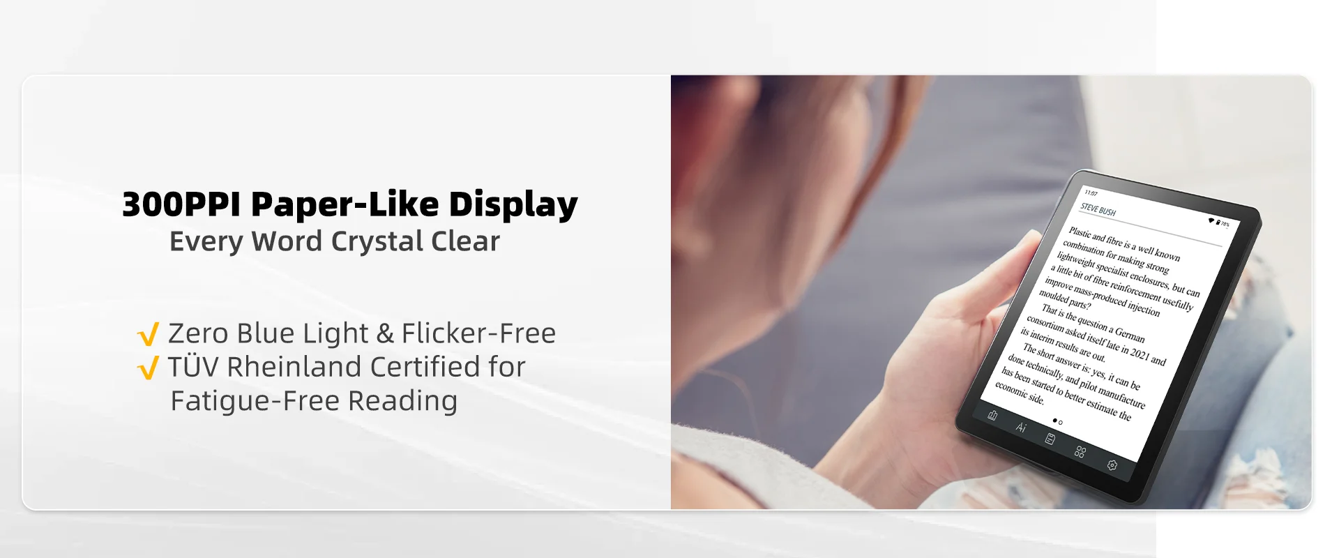 E Ink display delivers 300 PPI precision and 150PPI for color contents, rendering text and images with print-on-premium-paper clarity. Every detail emerges sharp and vivid. Its flush-front design creates a modern aesthetic while boosting screen smoothness and durability.