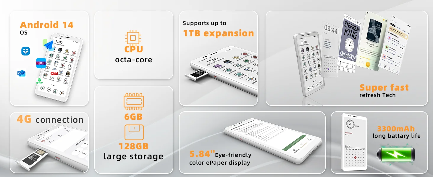 1. It features a 5.84-inch E Ink display with Color versions. Experience a paper-like reading experience with the e-ink display, reducing eye strain and enhancing readability.