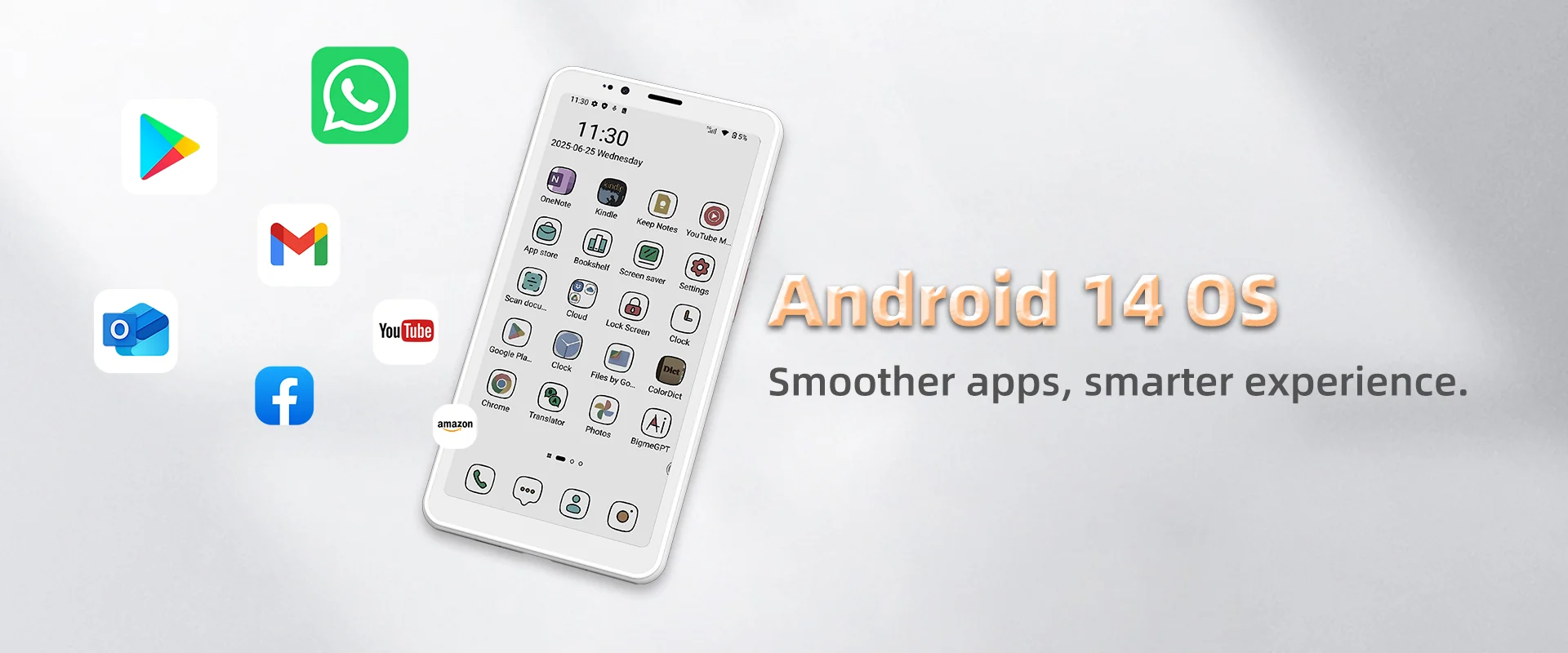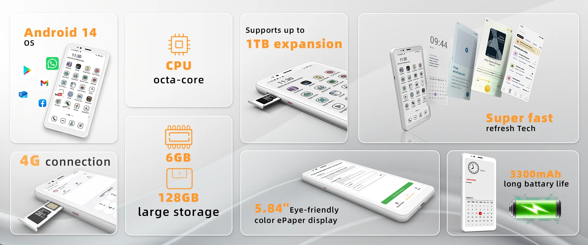 1. It features a 5.84-inch E Ink display, available in both Black&White and Color versions. Experience a paper-like reading experience with the e-ink display, reducing eye strain and enhancing readability.