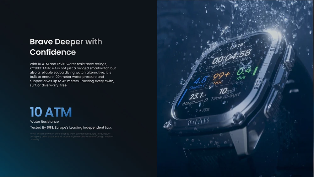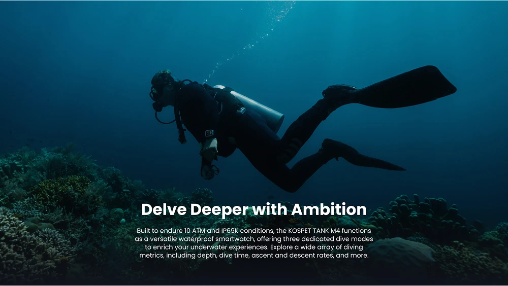 Boasting 10 ATM and IP69K ratings, the waterproof smart watch is built for demanding underwater activities, including freediving to depths of 148 feet. Its robust construction ensures it remains securely sealed and reliable under pressure.