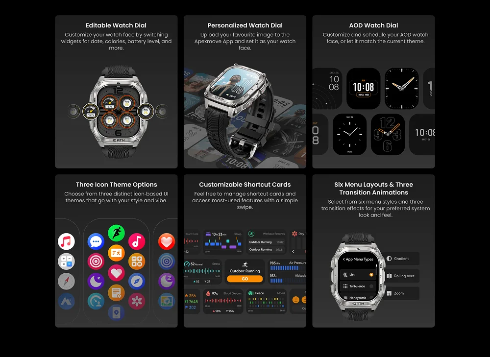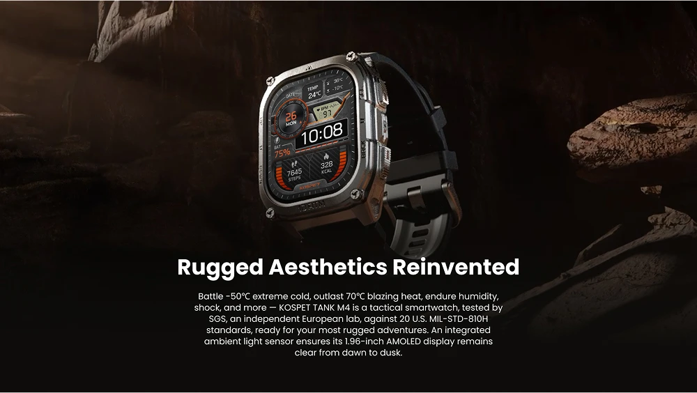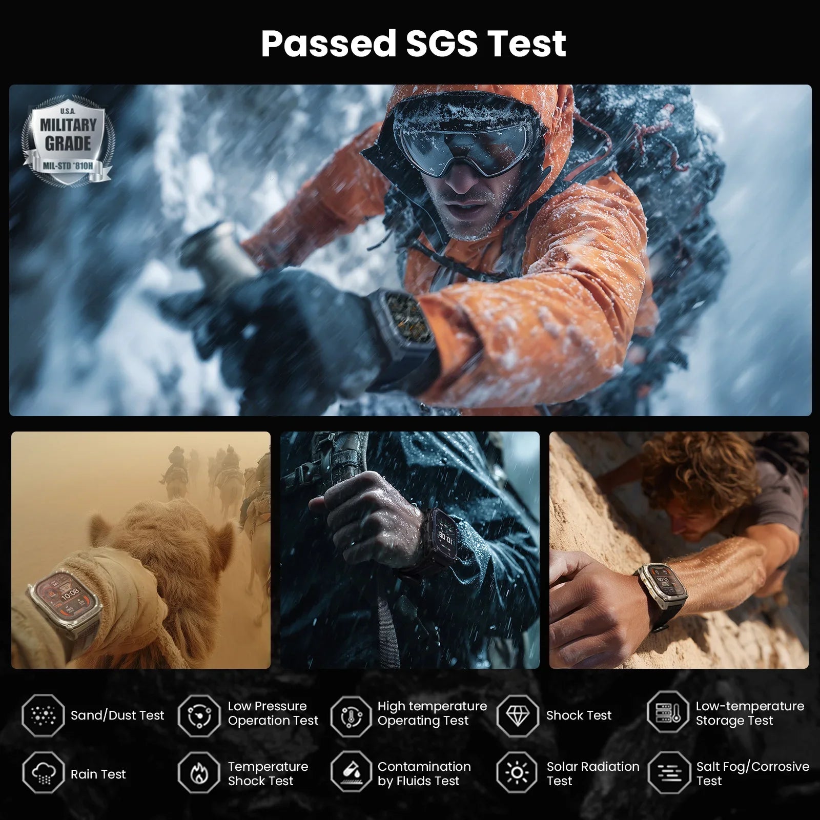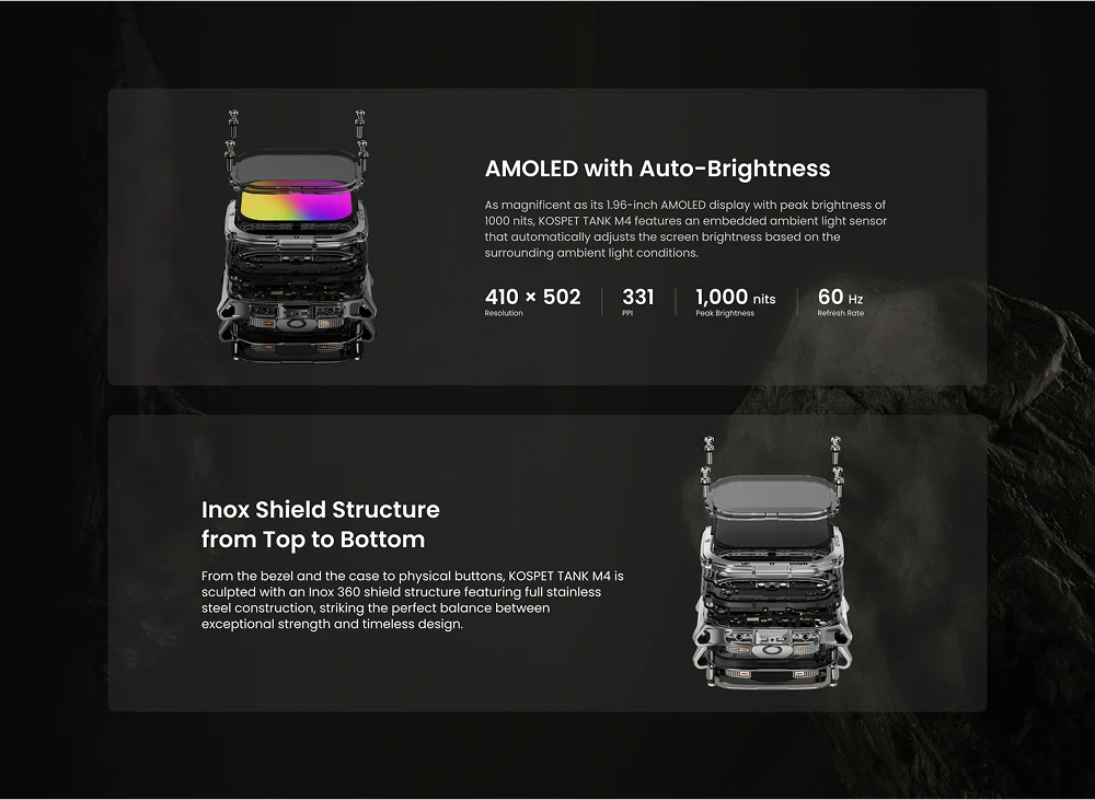 Built with the Inox 360 Shield structure, this rugged smart watch features a durable stainless steel body engineered to withstand extreme conditions—from deep freezes at -58°F to intense heat up to 158°F, Certified by 20 U.S. military-standard tests for proven reliability in the harshest conditions. The 1.96” AMOLED display, equipped with with a 3rd generation Corning Gorilla 9H double-layer glass.