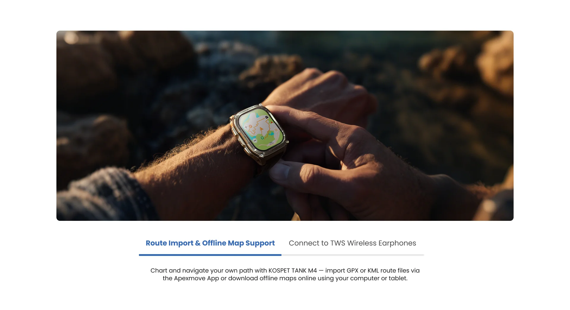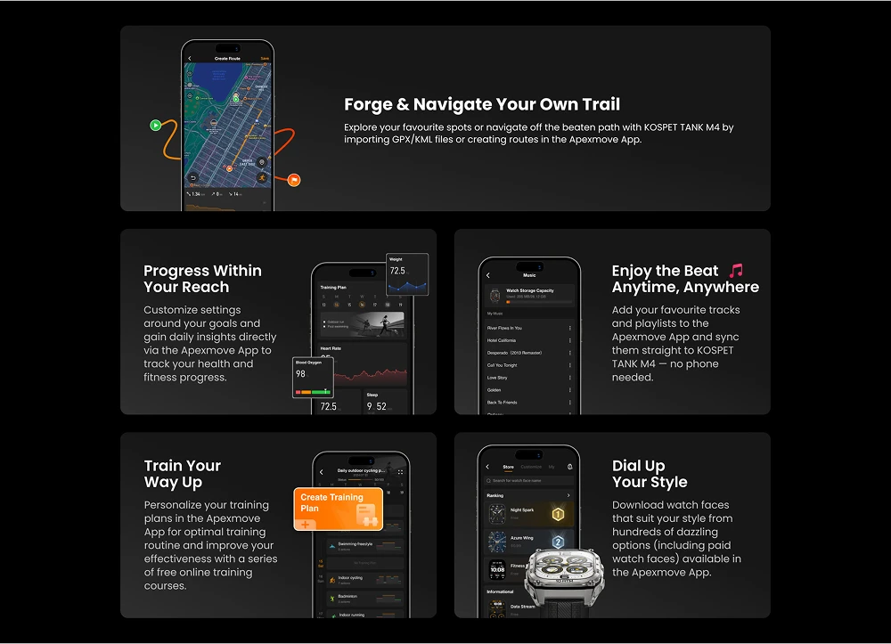 The TANK M4 GPS smartwatch tracks your movements with outstanding accuracy, powered by an industry-leading dual-band GNSS positioning that connects to six satellite systems. Simply download offline maps and select your route or destination point to run your favorite paths or explore unfamiliar trails.