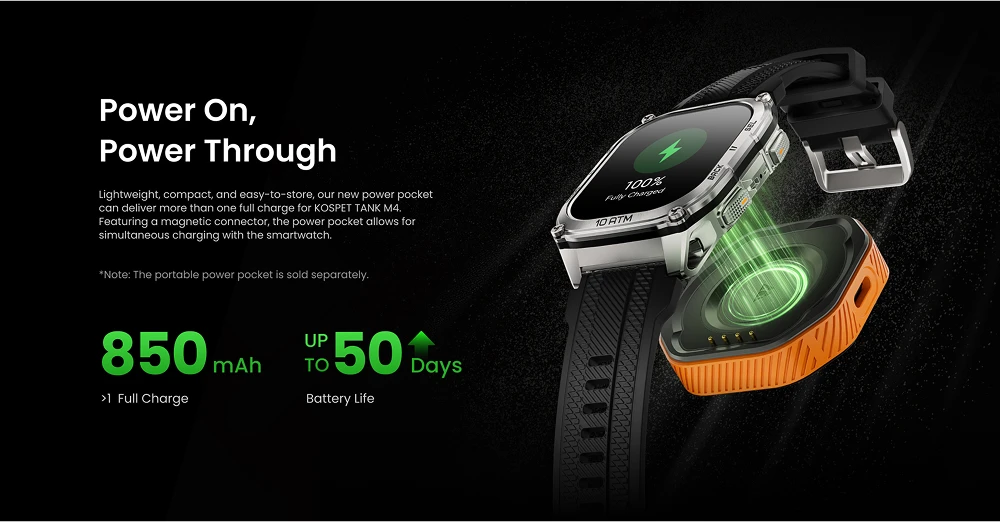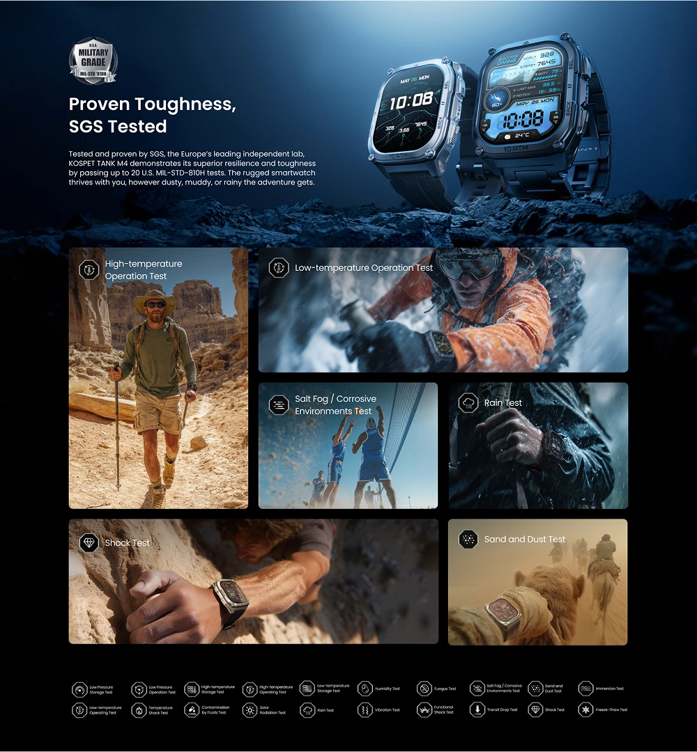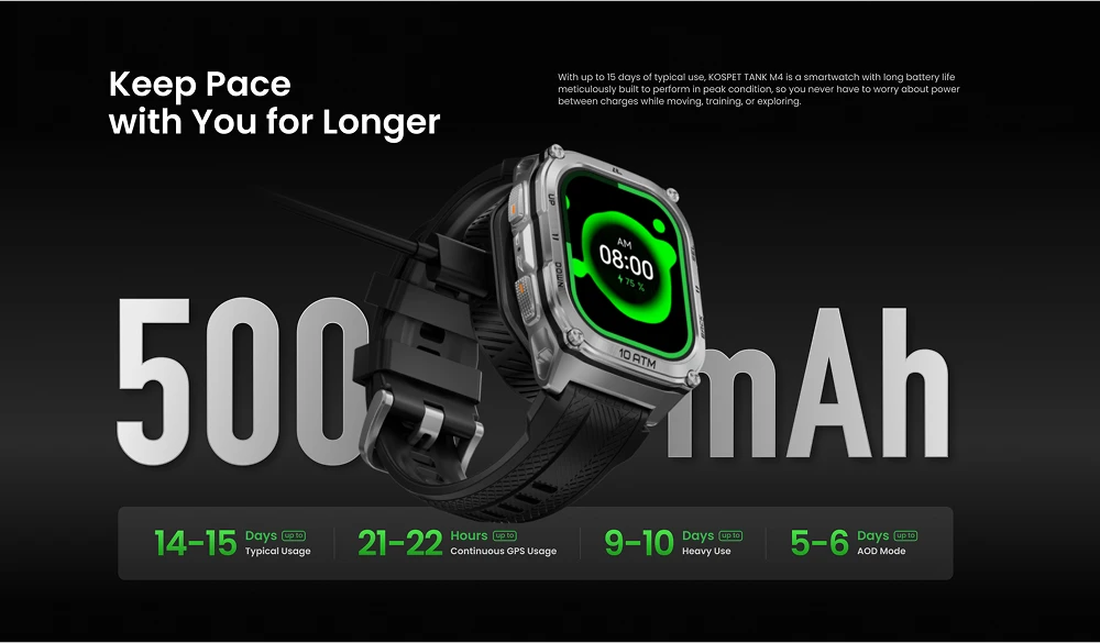KOSPET TANK M4 outdoor smart watch, enjoy up to 15 days of battery life on a single charge with typical use, up to 22 hours in GPS mode, providing long-lasting performance for outdoor activities–enough for hiking, longest running, or cycling.