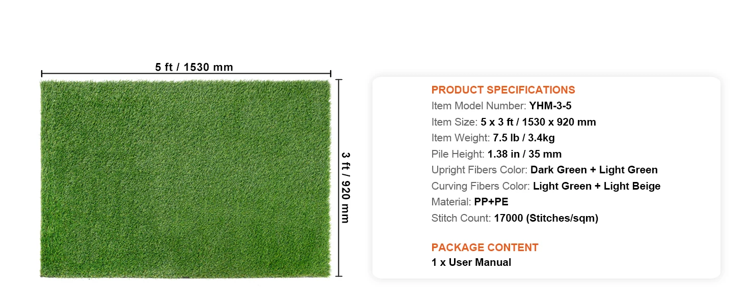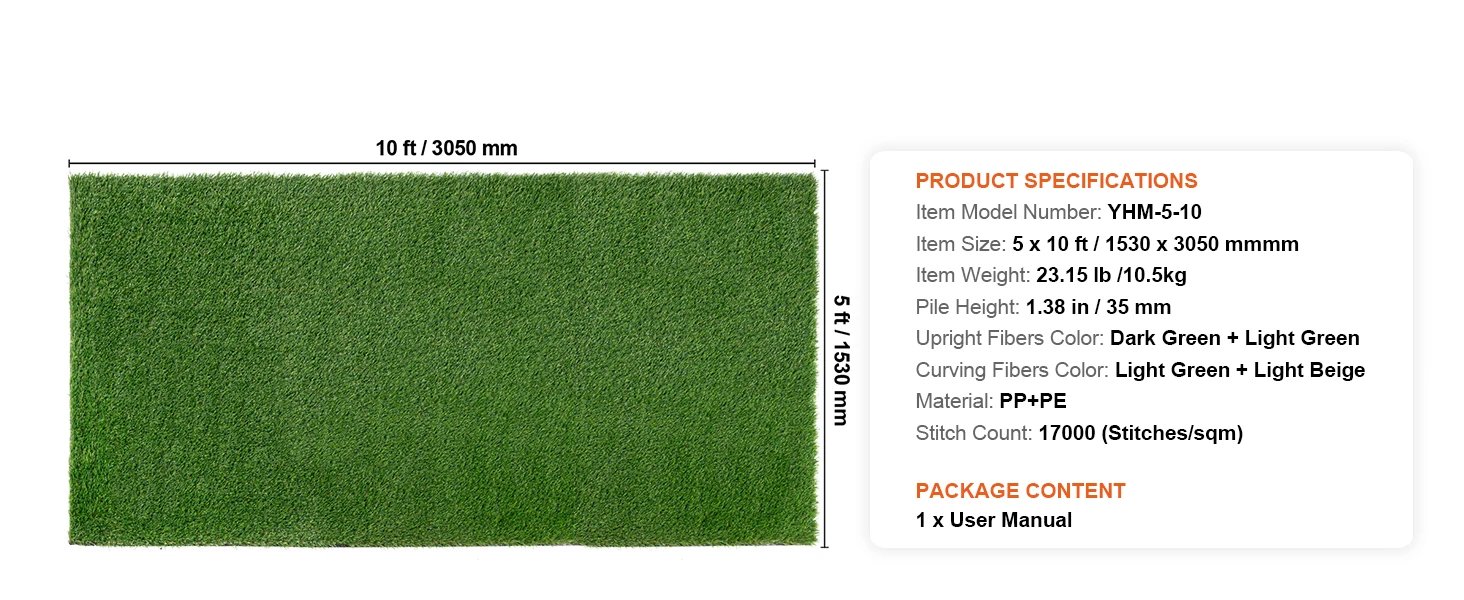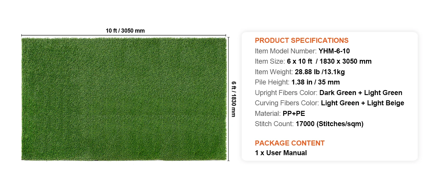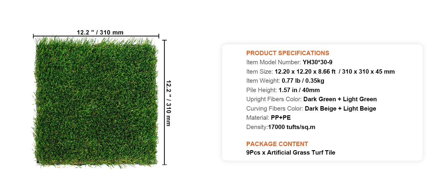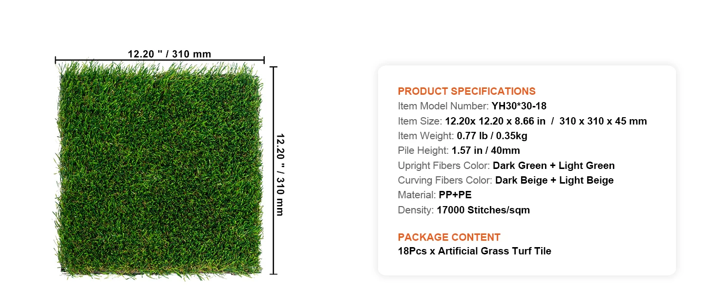 High-Density Grass Fibers: Our artificial turf features a design with four-color high-density grass fibers, imitating the natural color variations of real grass, adding a touch of green to your space. With a grass height of 1.38" and a density of 17,000 stitches, it offers a soft and comfortable touch.